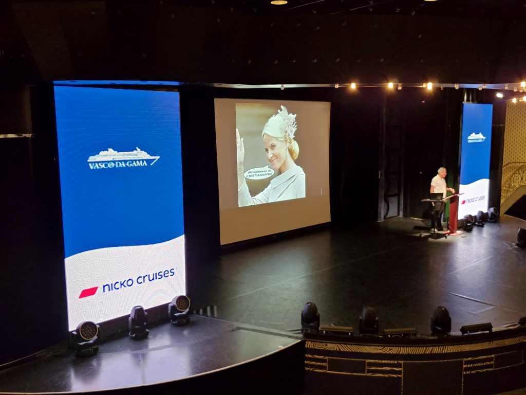 Für unseren Tag in Kristiansand hatten wir einen Stadtrundgang mit Besichtigung des Kristiansand Museums direkt über Nicko Cruises gebucht. Treffpunkt war im Theater Hollywood Show Lounge. Nach kurzer Kontrolle der Tickets und Zuweisung unserer Busnummern verließen wir gemeinsam das Schiff und stiegen in den Bus. Dort wurden wir von einem lokalen, deutschsprachigen Guide begrüßt.